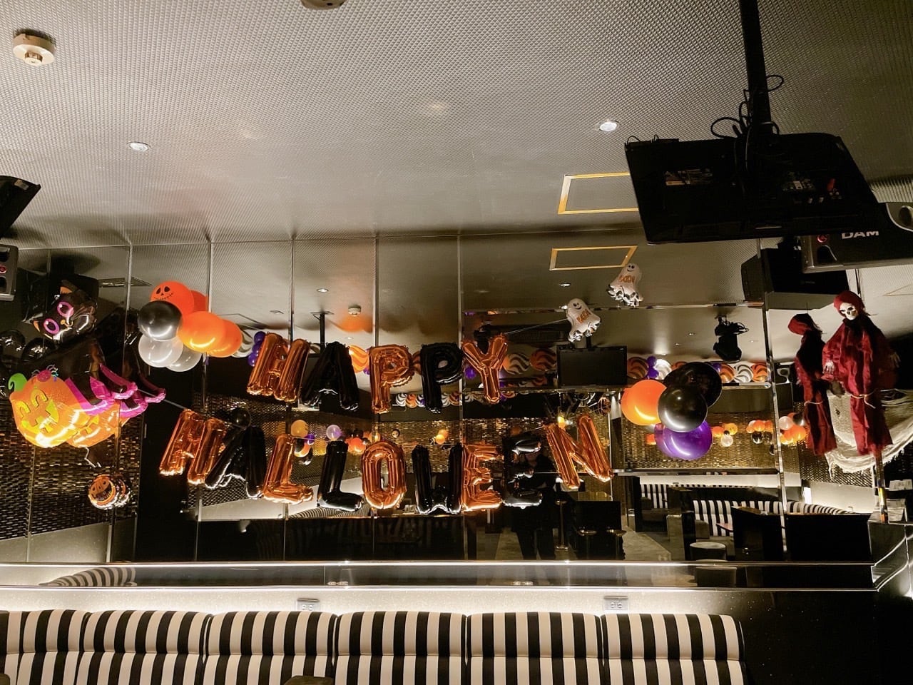 ハロウィン仕様のバルーンや小物を使った店内装飾になります♪